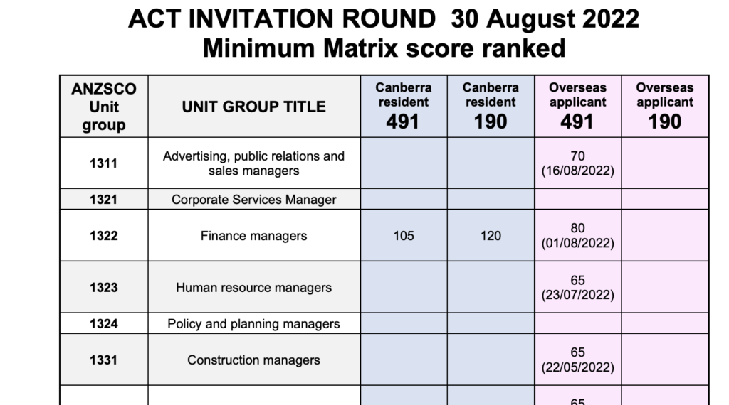 Invitation Round Canberra Matrix Invitation Round: 30 August 2022 August 31, 2022 · canberra View in Mobile 2022-2023 Allocation of ACT Nomination Places:The ACT received an interim allocation for the 2022-2023 program year.Skilled Nominated (subclass 190) visa: 800 placesSkilled Work Regional (subclass 491) visa: 1920 placesApplication Count @ 30 August 2022Total approvals: 338 approvals190 Nominations: 119 approvals491 Nominations: 219 approvalsTotal refusals: 72 applications190 Nominations: 24 refusals (17%)491 Nominations: 48 refusals (18%)Remaining Allocation 2022-2023Total allocation remaining: 2382 nomination places (227 per month)190 Nominations: 681 (pro rata 68 per month)491 Nominations: 1701 (pro rata 170 per month)